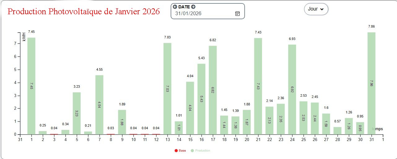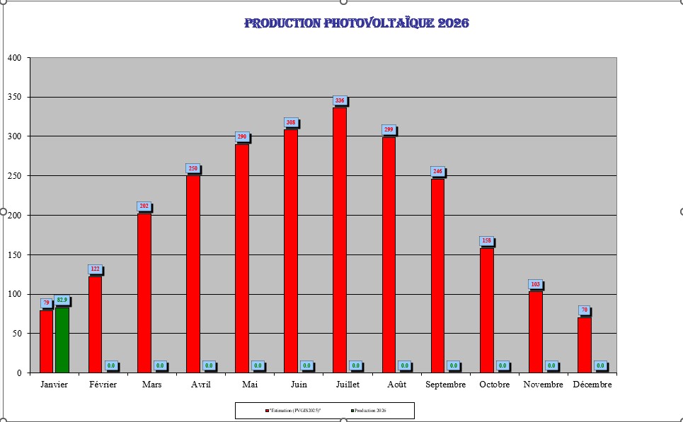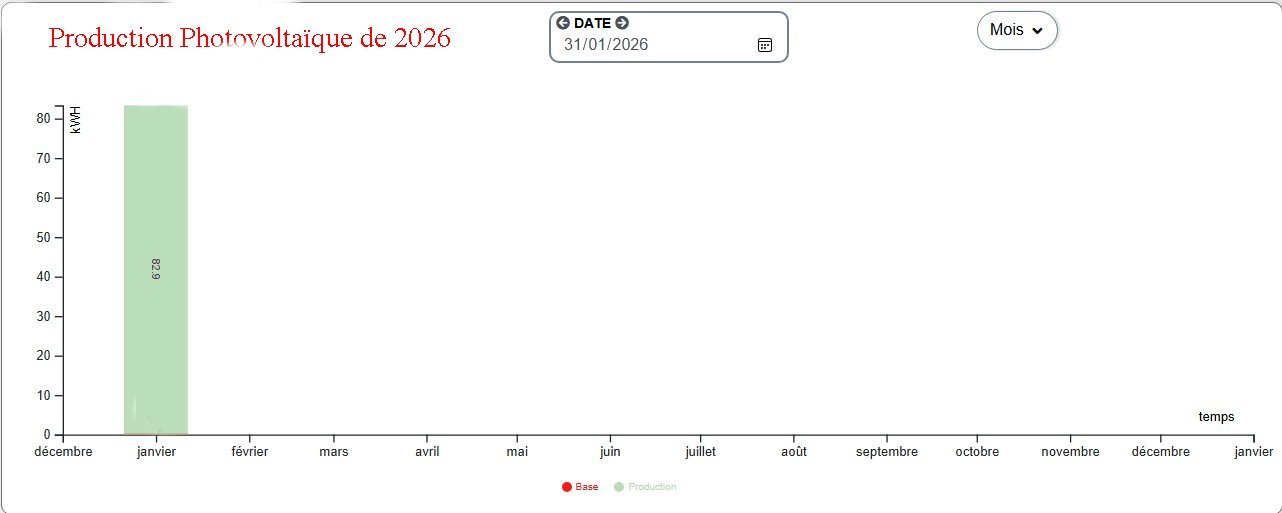 En rouge "Production prévue PVGIS" et en vert "Production constatée"